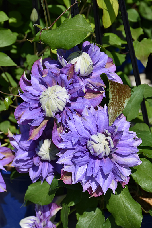 Diamantina Clematis is covered in stunning fully double violet round flowers with blue overtones and white eyes at the ends of the branches from late spring to early fall. It has dark green deciduous foliage. The compound leaves do not develop any appreciable fall colour.