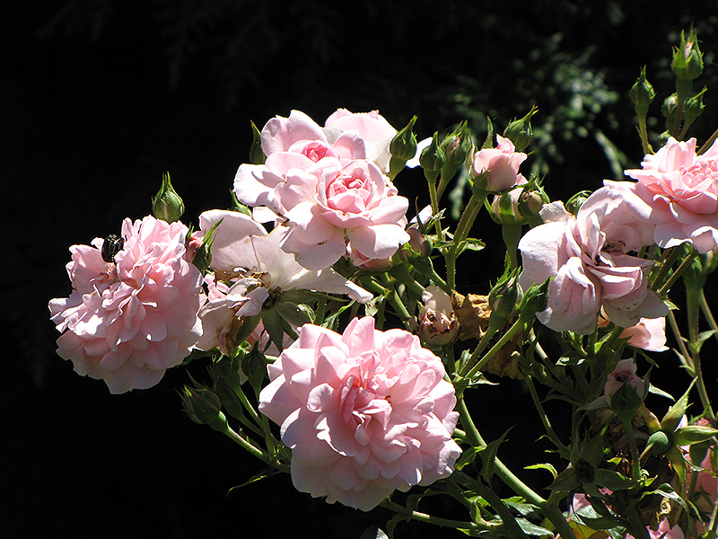 A Meidiland series rose, absolutely smothered in double light pink flowers in early summer, repeat-blooming; compact, mounded habit, quite hardy and resistant to disease, a valuable garden shrub; all roses need full sun and well-drained soil