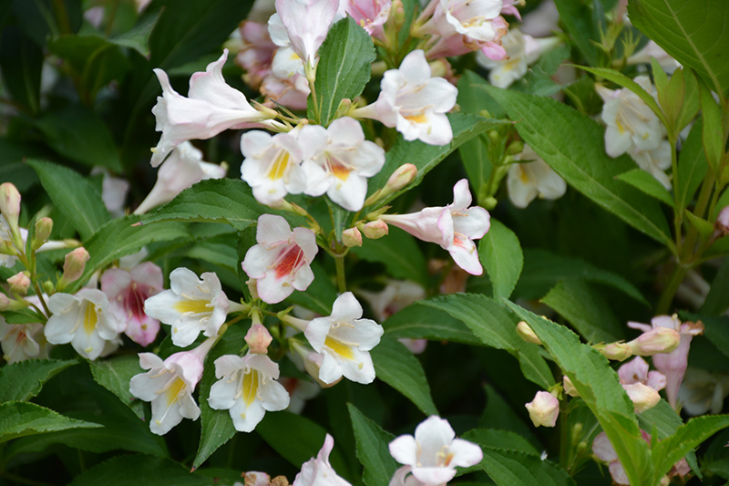 Sonic Bloom® Pearl Reblooming Weigela features showy clusters of white trumpet-shaped flowers with shell pink overtones and yellow throats along the branches from late spring to mid fall. It has attractive green deciduous foliage which emerges coppery-bronze in spring. The glossy pointy leaves are highly ornamental but do not develop any appreciable fall colour.