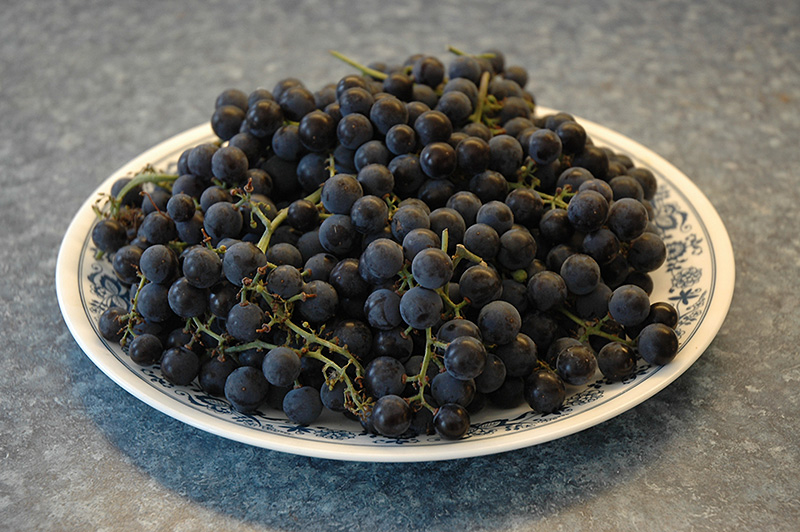 An improvement on hardy grapes, featuring large, sweet and abundant dark purple fruit, good for jellies or juice; excellent for covering arbors or trellises, trailing walls or along a fence; needs a pollinator for best results