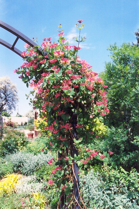 A very popular vine valued for its exceptionally colorful pinkish-red tubular flowers which are produced over a very long period; very easy to grow and not excessively aggressive, a great choice for arbors and trellises