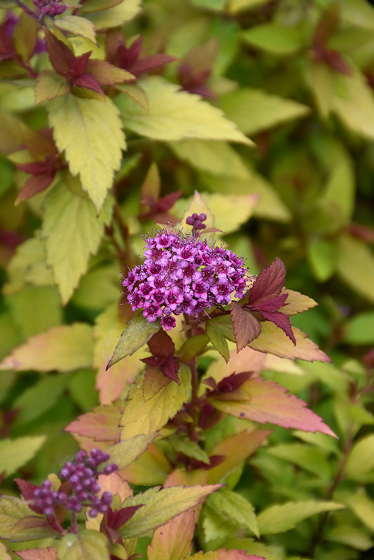 Poprocks™ Rainbow Fizz™ Spirea is smothered in stunning clusters of pink flowers at the ends of the branches from late spring to early summer, which emerge from distinctive red flower buds. It has attractive red-tipped yellow foliage with hints of light green which emerges coppery-bronze in spring. The small serrated pointy leaves are highly ornamental and turn outstanding shades of coppery-bronze and in the fall.