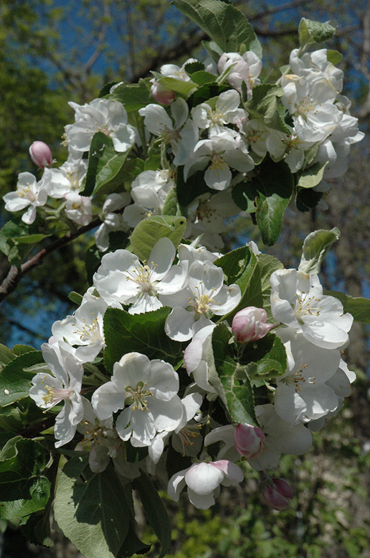 Red Sparkle Apple features showy clusters of lightly-scented white flowers with shell pink overtones along the branches in mid spring, which emerge from distinctive pink flower buds. It has forest green deciduous foliage. The pointy leaves turn yellow in fall. The fruits are showy light green apples with a scarlet blush, which are carried in abundance from late summer to early fall. The fruit can be messy if allowed to drop on the lawn or walkways, and may require occasional clean-up.