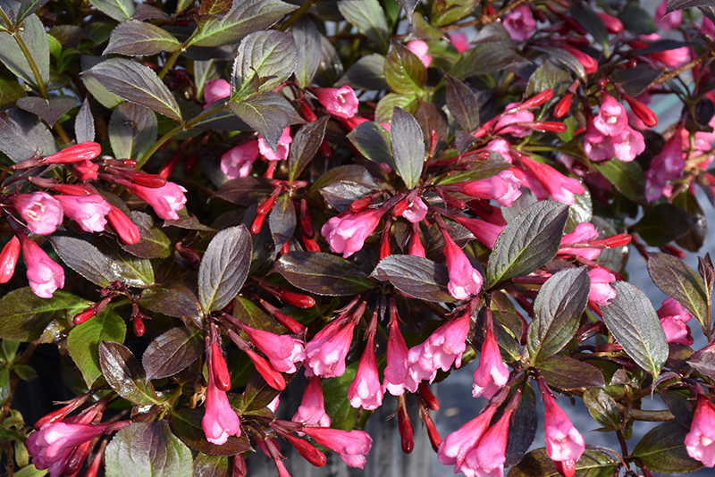 Very Fine Wine® Weigela features showy clusters of rose trumpet-shaped flowers with pink overtones along the branches in late spring, which emerge from distinctive red flower buds. It has attractive burgundy foliage with hints of deep purple. The pointy leaves are highly ornamental and turn outstanding shades of deep purple and in the fall.