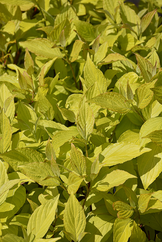 Prairie Fire Dogwood has attractive chartreuse deciduous foliage which emerges gold in spring on a plant with a round habit of growth. The pointy leaves are highly ornamental and turn an outstanding red in the fall. It has clusters of creamy white flowers at the ends of the branches in late spring. It produces white berries in mid summer. The tomato-orange branches are extremely showy and add significant winter interest.