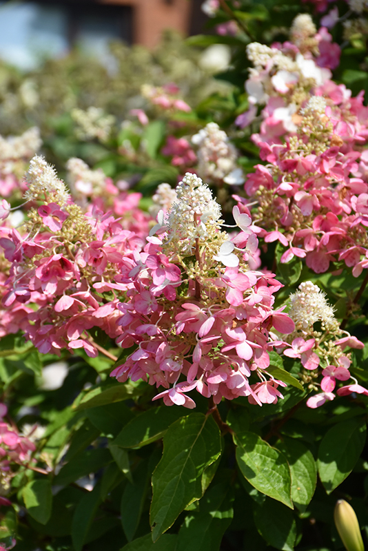 A beautiful compact shrub presenting cone-shaped panicles of white flowers in summer, that gradually fade to bright reddish-pink from the bottom up; somewhat coarse in appearance, regular pruning recommended; needs acidic well-drained soil