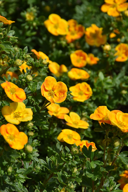 Bella Sol® Potentilla is covered in stunning orange cup-shaped flowers at the ends of the branches from late spring to early fall. It has dark green deciduous foliage. The small ferny compound leaves do not develop any appreciable fall colour.