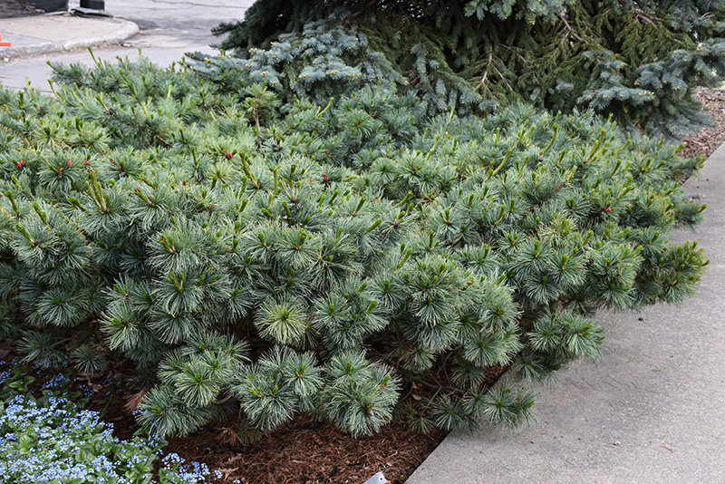 Blue Dwarf Japanese Stone Pine is a dwarf conifer which is primarily valued in the garden for its broadly spreading habit of growth. It features showy red catkins along the branches in late spring. It has attractive forest green foliage with silvery blue stripes which emerges light green in spring. The needles are highly ornamental and remain forest green throughout the winter.
