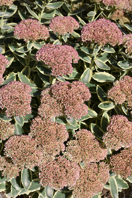 Autumn Charm Stonecrop has masses of beautiful clusters of pink flowers at the ends of the stems from late summer to late fall, which emerge from distinctive coral-pink flower buds, and which are most effective when planted in groupings. The flowers are excellent for cutting. Its attractive large succulent oval leaves remain green in colour with showy yellow variegation throughout the season.